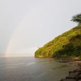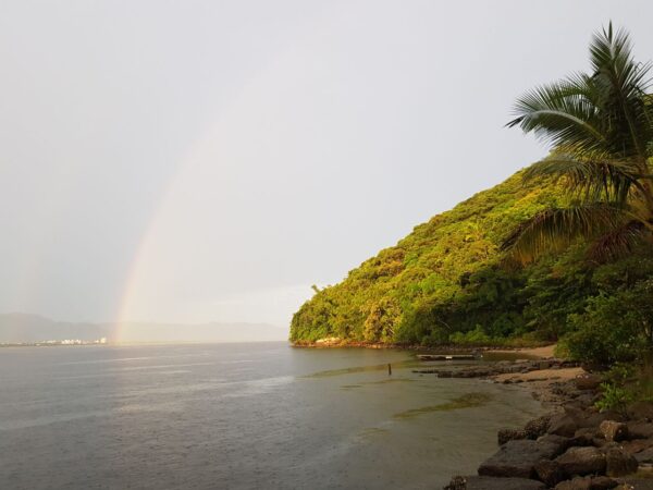 Arco iris após chuva de verão que cai sobre a Praia de Bertioga